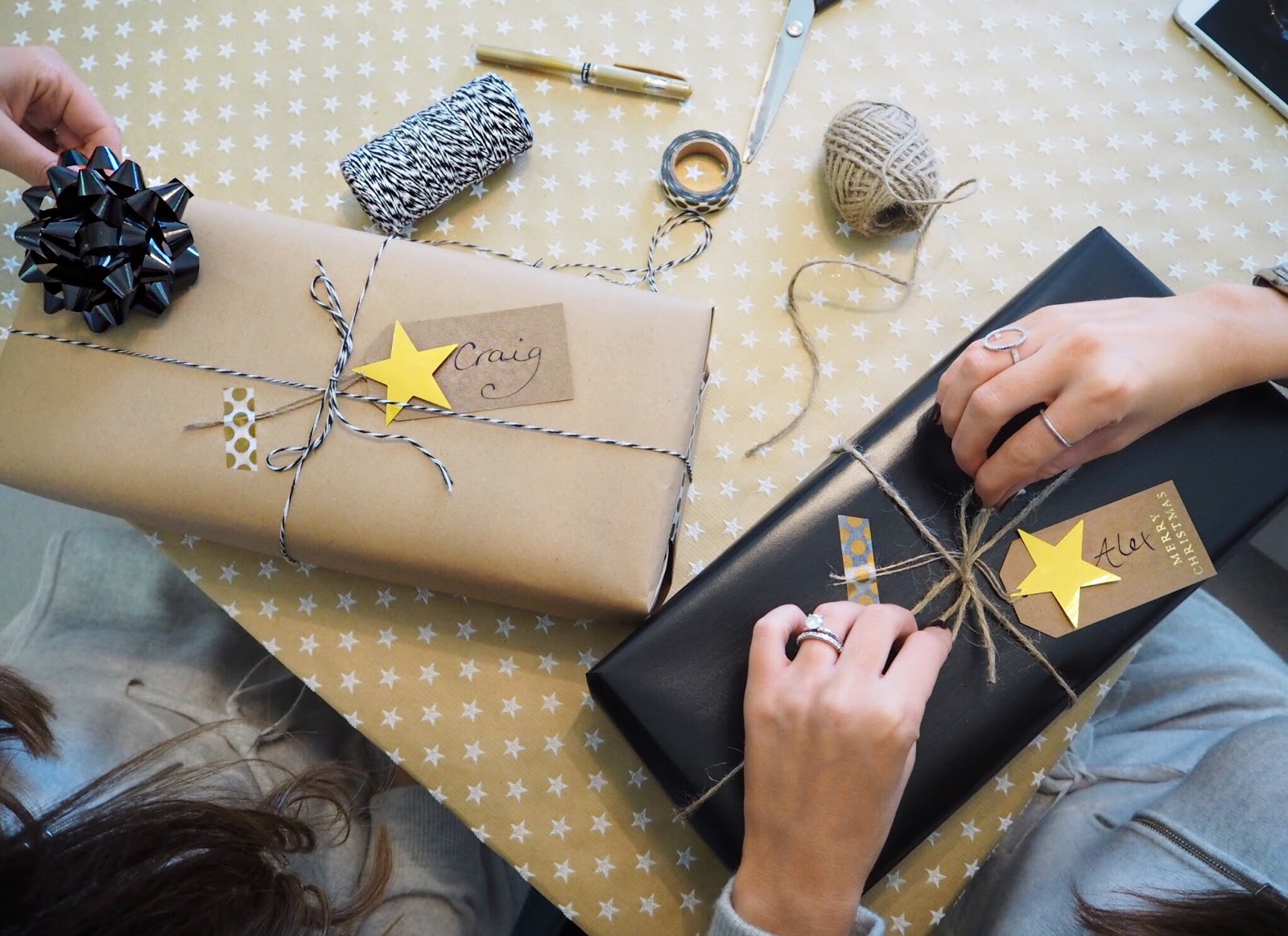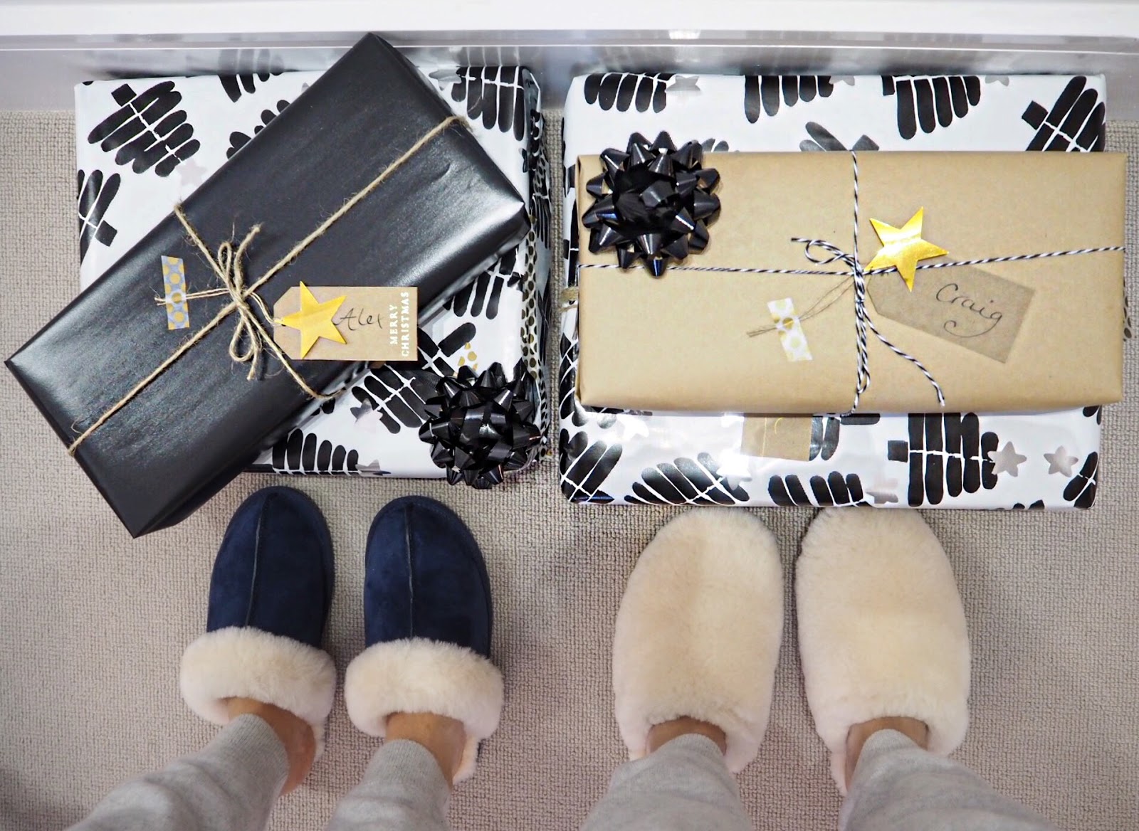 This Saturday we spent most of the day getting a head start wrapping a few Christmas presents for our nearest and dearest. You can imagine quite a lot of thought goes into our wrapping situation and this year we opted for a palette of black, white and gold with pops of brown paper. Yups, we keep it sleek and simple even when it comes to wrapping! It’s definitely a task we’ve come to grow and love and the prettier the presents look the better 🙂