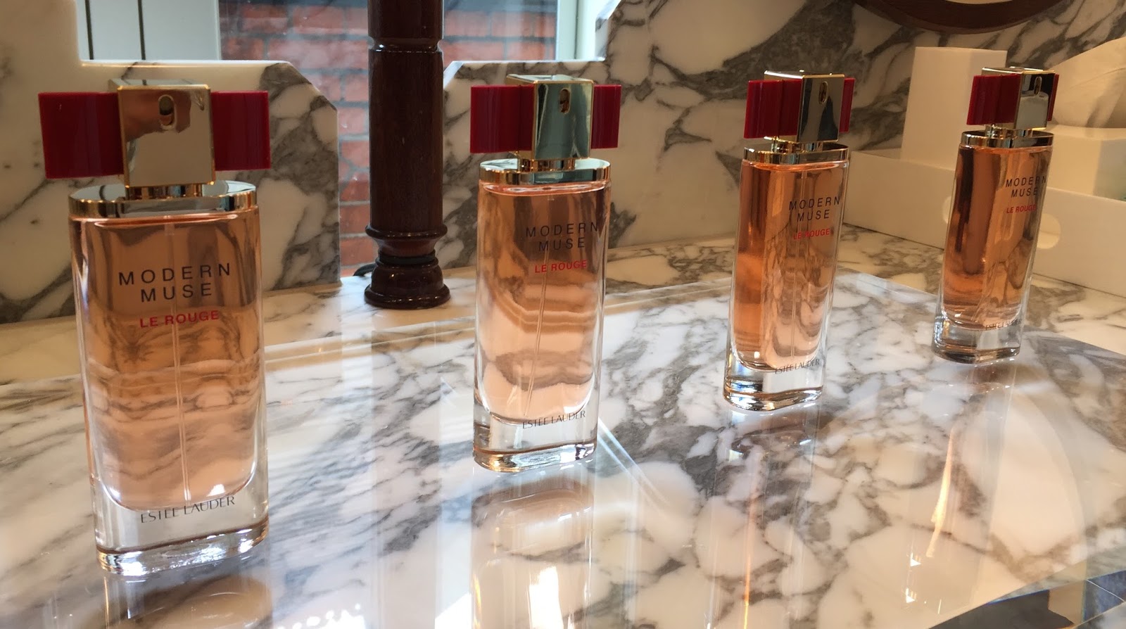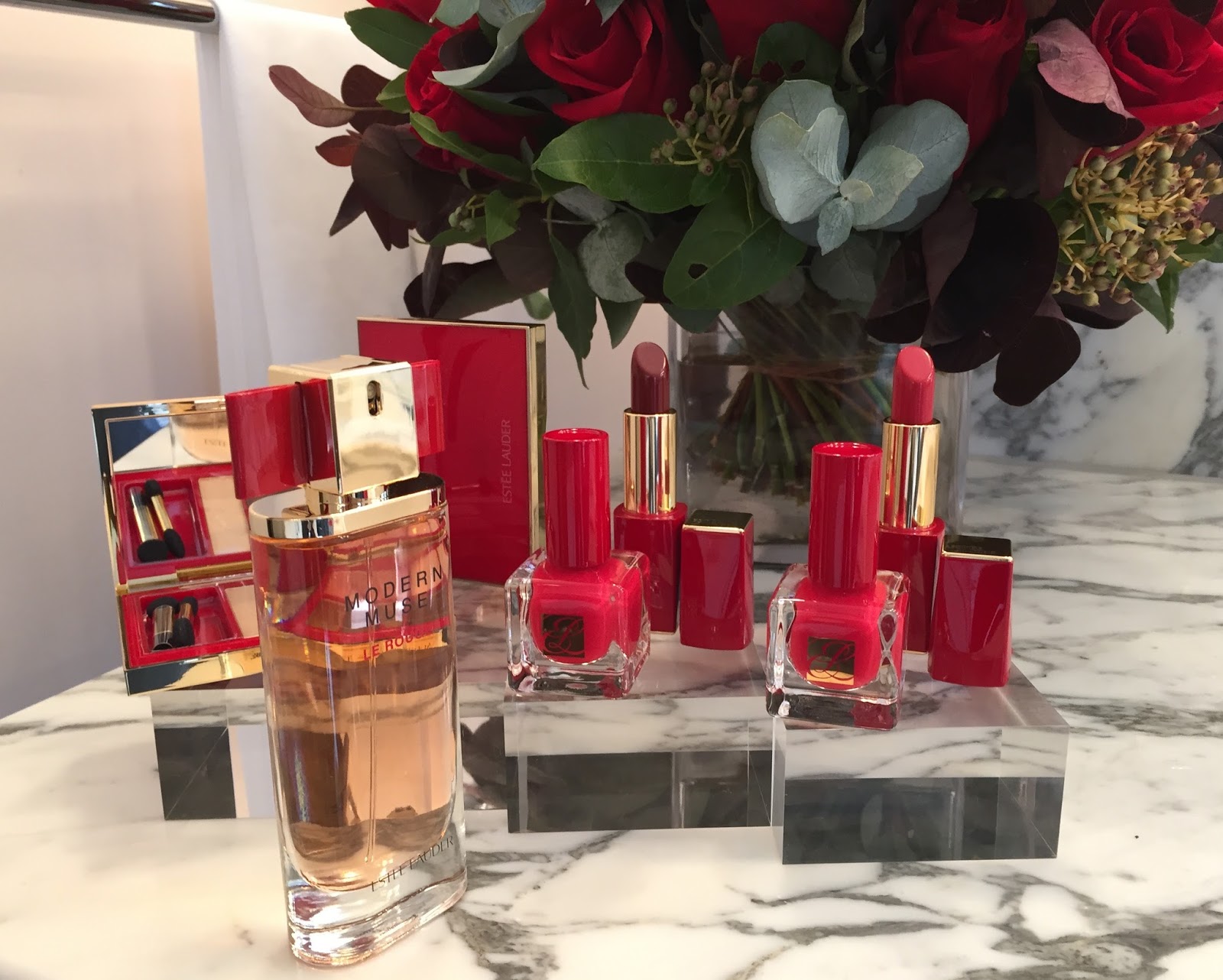 We were so excited when Estée Lauder got in touch with us to ask to if we wanted to help with the press launch of the ‘Modern Muse Le Rouge’ perfume… ok, “so excited” was a slight understatement, we were ecstatic! Having both become true lovers of Estée’s iconic products like Double Wear Light (Philippa wore this on her wedding day and can’t recommend it enough for super long lasting foundation coverage) & Night Repair (this is our ultimate must have product for glowing complexion – we use it every night without fail), we couldn’t believe that we were being asked to work alongside this beauty empire.